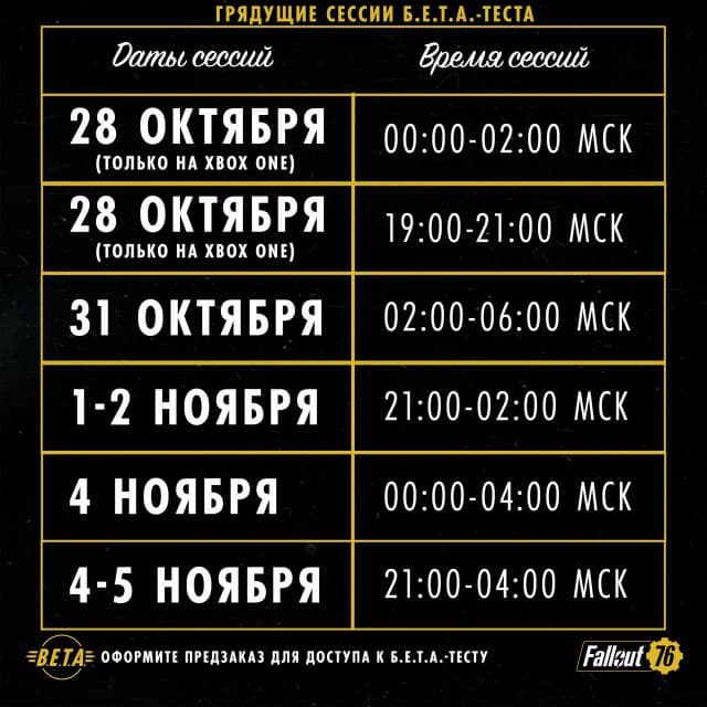 Bethesda объявила даты и время проведения бета-тестов Fallout 76 на следующей неделе для игроков оформивших предзаказ. Ранее вице-президент компании и глава по маркетингу Пит Хайнс говорил, что этапы тестирования будут представлять собой ежедневные включения серверов на срок от 4 до 8 часов. И немного слукавил.