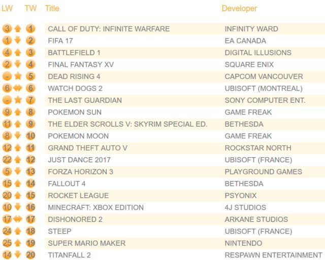 Компания Chart-track опубликовала свежие данные о продажах игр на территории Соединённого королевства. На первое место вернулся шутер Call of Duty: Infinite Warfare, опередив FIFA 17 и Battlefield 1. Японская ролевая игра Final Fantasy XV опустилась со второй на четвёртую строчку.