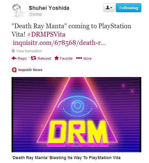 На официальной Twitter-страничке главы Sony Computer Entertainment Worldwide Studios Сюхэй Ёсида (Shuhei Yoshida) был опубликован анонс версии игры Death Ray Manta для PS Vita.