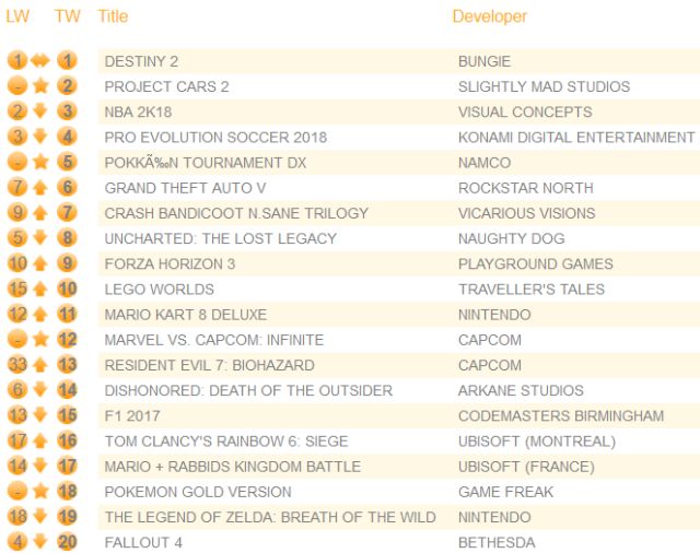 Компания Chart-track опубликовала свежие данные о продажах игр на территории Соединённого королевства. На первом месте остался проект Destiny 2. До второй строчки доехал автомобильный симулятор Project Cars 2.