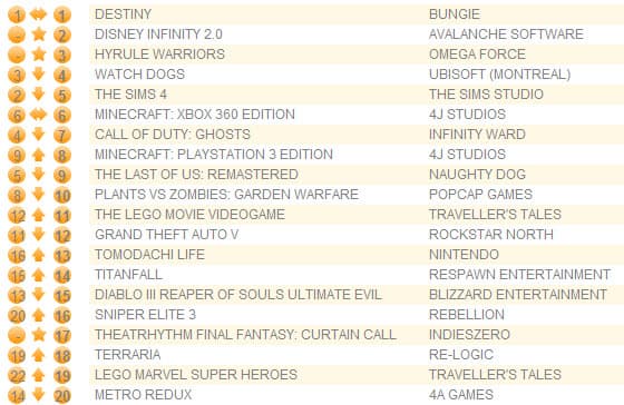 Бандл Destiny с белой PS4 продолжает подстегивать продажи консоли в регионе (+72%). Новинка Disney Infinity 2.0 стартовала на втором месте, на ступень выше оригинальной игры (продажи новой игры оказались на 32% выше). Эксклюзивный для Wii U экшен Hyrule Warriors оказалась на третьей позиции.