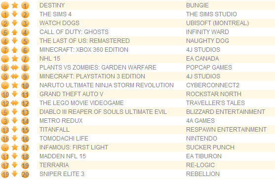 Симулятор жизни The Sims 4 опустился на второе место, Watch Dogs - на третье. Симулятор хоккея NHL 15 стартовал на седьмой позиции, а Naruto Shippuden: Ultimate Ninja Storm Revolution - на десятой. Коробочное издание самостоятельного дополнения inFamous: First Light дебютировало на 17-й строчке.