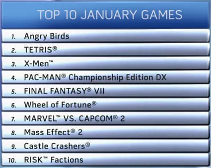 Возглавили чарт вездесущие злые птицы из Angry Birds - порт для PSN был выпущен в начале года. Tetris, предлагающий графику в разрешении 1080р, объемный звук 5.1 Dolby Surround, а также шесть локальных и онлайновых мультиплеерных режимов, занял второе место. Замыкает тройку лидеров X-Men.