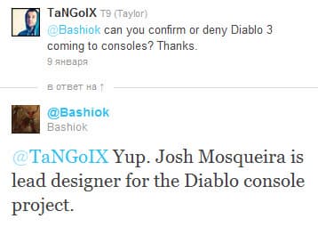 В twitter Bashiok'у задали следующий вопрос: «Можете ли подтвердить или опровергнуть информацию о том, что Diablo 3 появится на консолях? Спасибо». На что он ответил так: «Да. Джош Москуэйра является главным дизайнером консольного проекта Diablo».