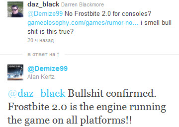Любители теорий заговора стали распускать слухи о том, что Frostbite 2.0 используется только в РС-версии игры. Но дизайнер игрового процесса Алан Кертз (Alan Kertz) из DICE заявил, что это полная чушь, добавив, что все версии Battlefield 3 создаются на базе нового движка Frostbite 2.0.