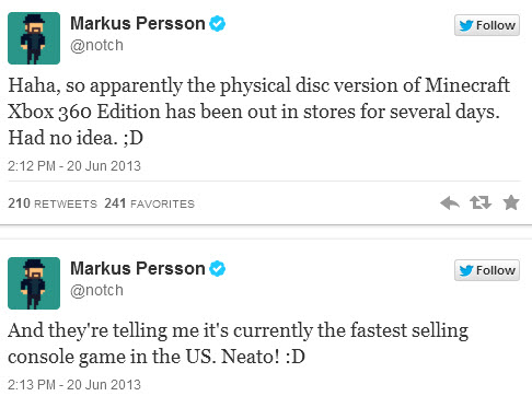 «Хаха, оказывается, дисковая версия Minecraft Xbox 360 Edition несколько дней назад поступила в продажу, - сообщил он. - И мне сообщают, что в данный момент это самая быстро распродаваемая консольная игра в США».