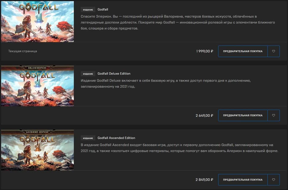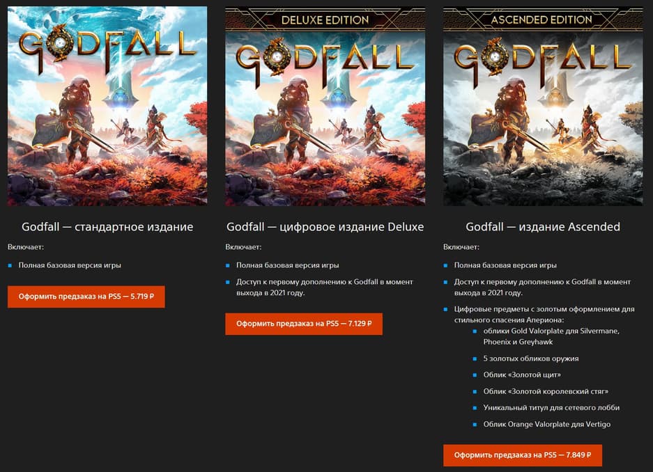 Стандартное издание игры для PS5 оценивается в 5719 рублей. Deluxe-издание с «доступом к первому дополнению к Godfall в момент выхода в 2021 году» обойдётся в 7129 рублей, а издание Ascended с дополнением и цифровыми бонусами стоит 7849 рублей.