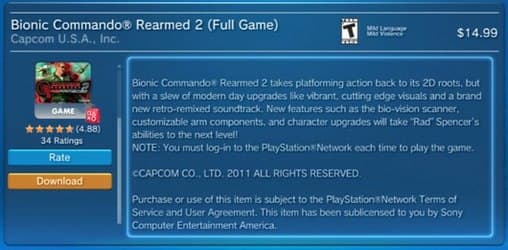 Теперь же на страничке Bionic Commando Rearmed 2 в PSN игроки видят соответствующее предупреждение, которое говорит о том, что перед каждым запуском игры вам нужно заходить под своей учетной записью в PSN.