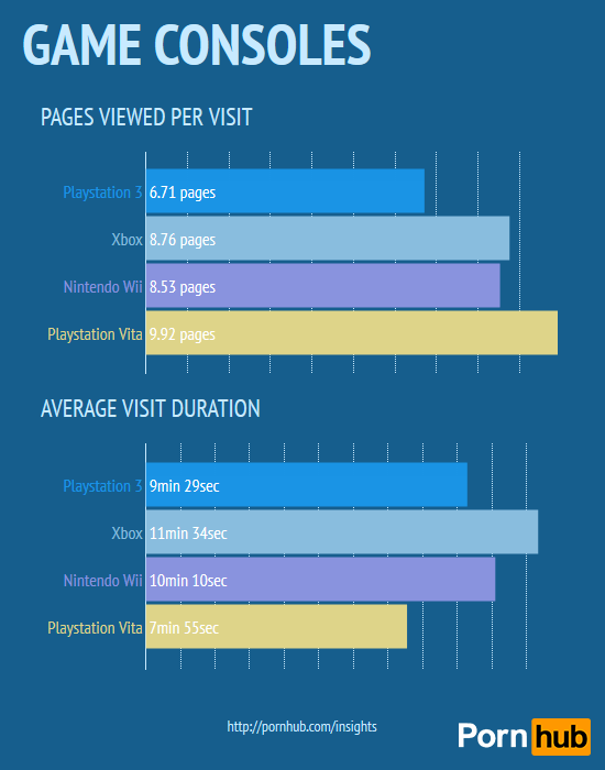 Наибольший трафик генерируют пользователи PlayStation (скорее всего, имеются в виду PS3 и PS4), на втором месте семейство Xbox. Примечательно то, что порно умудряются смотреть даже на 3DS.