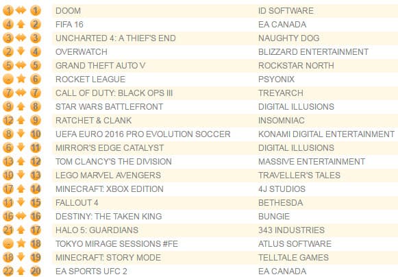Шутер Doom, который неделю назад вновь поднялся на вершину британского чарта, там и остался, несмотря на снижение продаж на 43%. На второе место поднялся футбольный симулятор Fifa 16, чему способствует проходящий Чемпионат Европы по футболу.