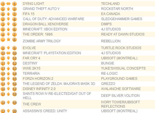 Зомби-экшен Dying Light продолжает лидировать в британском чарте, несмотря на 48-процентное снижение продаж. На второе место с пятого вернулась Grand Theft Auto V, третье занимает футбольный симулятор FIFA 15, который также отыграл три позиции.
