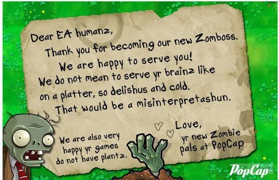 Письмо, отправленное сотрудниками PopCap своим новым владельцам.