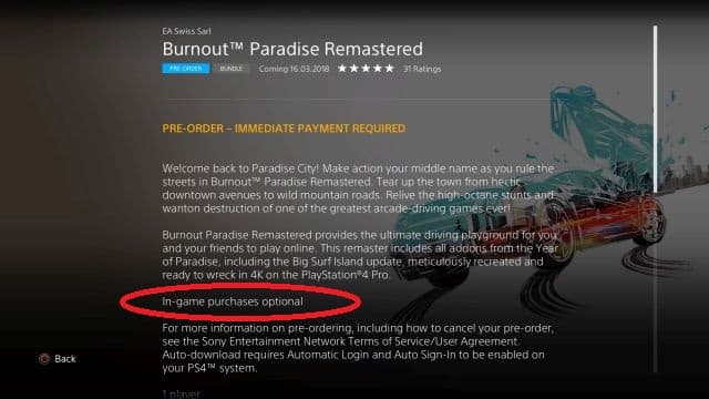 Вчерашний анонс ремастера Burnout Paradise от EA и Criterion Games не стал неожиданностью, так как слухи о нём появились гораздо раньше. Неожиданным стало упоминание на странице игры наличия «необязательных покупок», так как в оригинальной игре их не было.