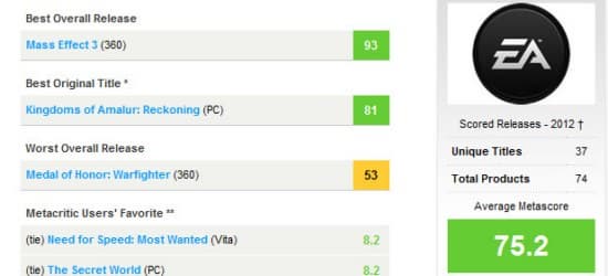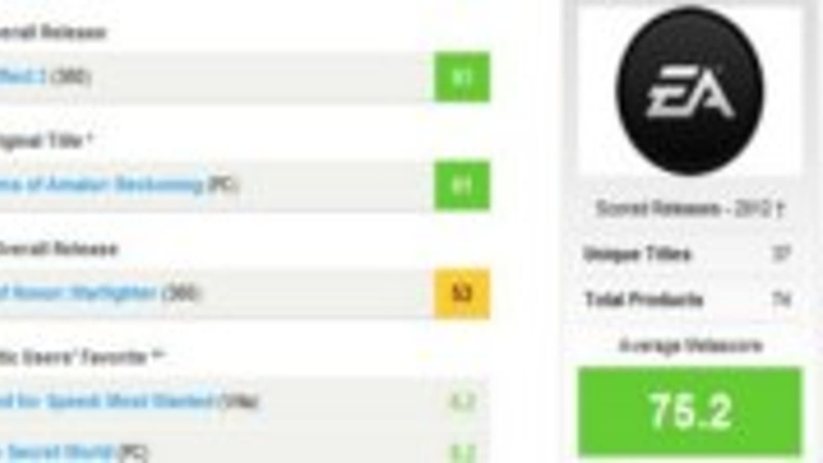 Лидером оказалась ЕА со средним баллом 75,2/100 и 37 уникальными релизами, кроме ЕА выше 75/100 подняться не удалось никому. На втором месте оказалась Microsoft - 42 самостоятельных релиза со средним баллом 73/100. Третье досталось Sony - 45 игр и 72,3/100. Nintendo, которая годом ранее занимала второе место, опустилась на две строчки вниз - 37 игр с усредненной оценкой 72,2/100.