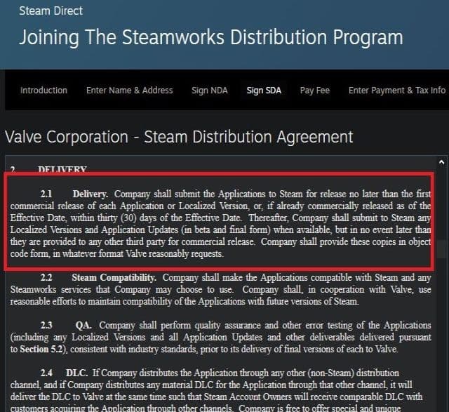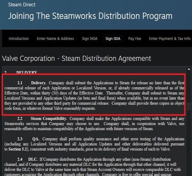Согласно новому условию, если издатель создал страницу в Steam и объявил дату релиза, то должен выпустить продукт не позднее 30 дней с момента выхода на других платформах. При несоблюдении данного пункта издателя могут отключить от программы Steamworks.