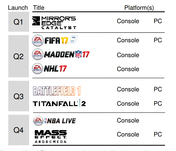 Кроме того, издатель опубликовал график своих новых релизов на этот год. В июне в продажу поступит Mirror's Edge Catalyst. Во втором квартале (финансового года) выйдут новые части спортивных серий Madden, FIFA и NHL.