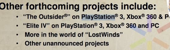 Frontier продолжает заниматься разработкой приключенческого боевика The Outsider для этих же платформ. Кроме того, в разработке находится продолжение яркого платформера LostWinds для WiiWare, а также еще один, пока неанонсированный проект.