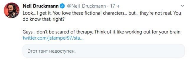 «Понимаю. Вы любите этих вымышленных персонажей, но… они не настоящие. Вы же это знаете? Ребята, не бойтесь терапии. Посмотрите на это, как на тренировку для вашего мозга», - отметил Дракманн.