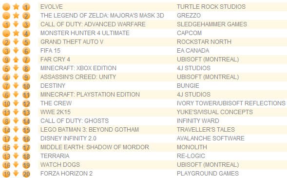На первой позиции оказался шутер Evolve, второе место досталось The Legend of Zelda: Majora’s Mask 3D для 3DS, Monster Hunter 4 Ultimate для той же портативной консоли оказался на четвертой строчке.