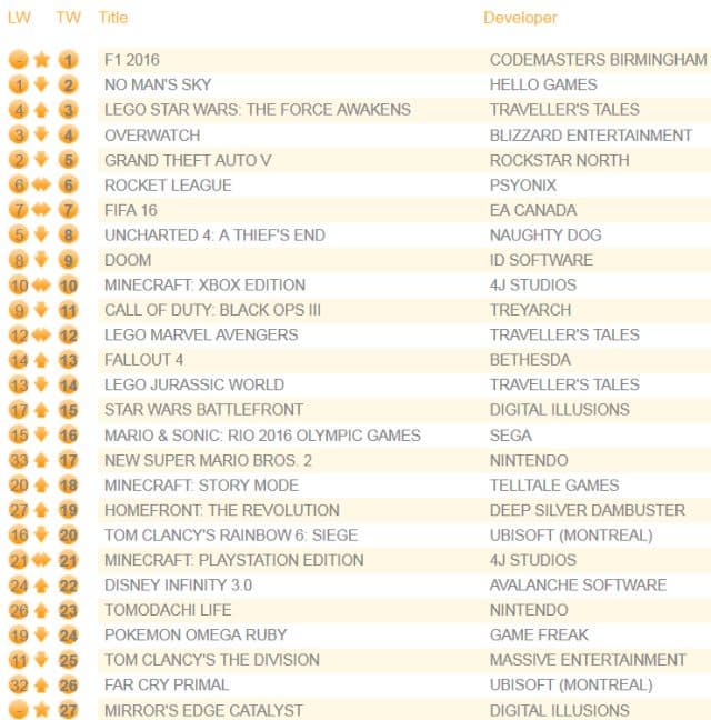 Продажи амбициозного космического приключения No Man’s Sky упали на 81%, а игра опустилась на вторую строчку чарта. Вслед за ней расположилась Lego Star Wars: The Force Awakens, продажи которой выросли на 13% благодаря выгодным предположениям от торговых сетей. Кроме того, Mirror’s Edge Catalyst поднялась с 40 на 27 строчку списка (+90%).