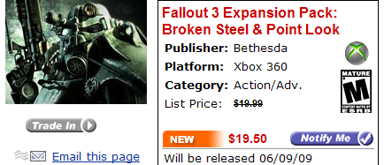 Небольшая американская компания eStarland, занимающаяся продажей консольных игр, на своем сайте отметила 9 июня 2009 года, как дату выхода сборника Fallout 3 Expansion Pack: Broken Steel & Point Look. По аналогии с недавно анонсированным дисковым изданием, в которое вошло два предыдущих дополнения, можно предположить, что Point Look - это и есть четвертое дополнение для Fallout 3.