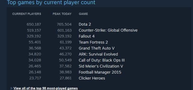 Если верить официальной статистике Steam, то на данный момент Fallout 4 является одной из самых популярных игр сервиса. Fallout 4 опережают только Dota 2 и Counter Strike: Global Offensive. Однако сегодня в течение дня Fallout 4 забирался на второе место.