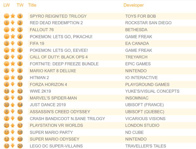 Лидером чарта без учёта особенностей изданий Pokémon Let's Go стал сборник Spyro Reignited Trilogy, сместивший лидера прошлых недель Red Dead Redemption 2 на второе место. 75% проданных копий Reignited Trilogy приходится на версию для PS4, оставшиеся 25% - на издание для Xbox One.