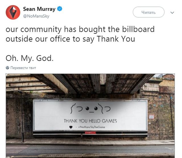 Участники сабреддита r/NoMansSkyTheGame решили поблагодарить Hello Games за поддержку и развитие No Man’s Sky. Энтузиасты за 14 часов собрали $1750 и выкупили рекламный щит, расположенный возле офиса студии. Жест фанатов привлёк внимание руководителя Шона Мюррея, который опубликовал фотографию билборда в твиттере.