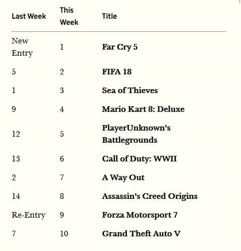 Продажи сетевого проекта Sea of Thieves снизились на 52% по сравнению с предыдущей неделей, а игра опустилась на третье место чарта, пропустив вперёд FIFA 18. Продажи A Way Out снизились на 61%, а игра опустилась на 7-е место.