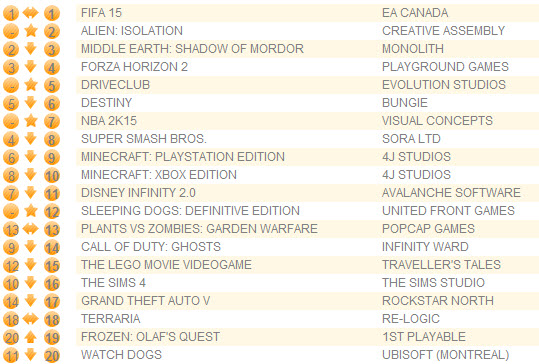 Лидером остается футбольный симулятор FIFA 15, которого совершенно не смутили три новые игры, оказавшиеся в первой десятке. Второе место досталось ужастику Alien: Isolation, приключенческий экшен Middle Earth: Shadow of Mordor переместился на третью строчку.