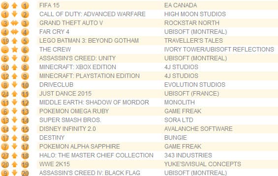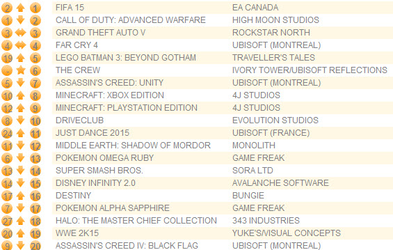 Футбольный симулятор FIFA 15 вновь поднялся на первое место, где он не был уже шесть недель. Шутер Call of Duty: Advanced Warfare переместился на вторую позицию, а Grand Theft Auto V осталась на третьей строчке.