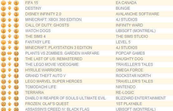 21-я часть серии FIFA, которая поступила в продажу на прошлой неделе, возглавила бриатнский чарт, причем на долю FIFA 15 пришлось 80% всех игровых продаж в регионе - это если говорить о количестве реализованных копий, а если оценивать денежный оборот, то речь идет о 87%.