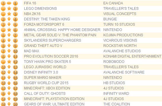 Лидером остается футбольный симулятор FIFA 16, на втором месте оказалась новинка Lego Dimensions, которая продемонстрировала результат лучше, чем Disney Infinity 3.0 и Skylanders Superchargers, играющие в том же жанре. Замыкает тройку лидеров NBA 2K16, продажи которой в мире за первую неделю превысили 4 млн копий.