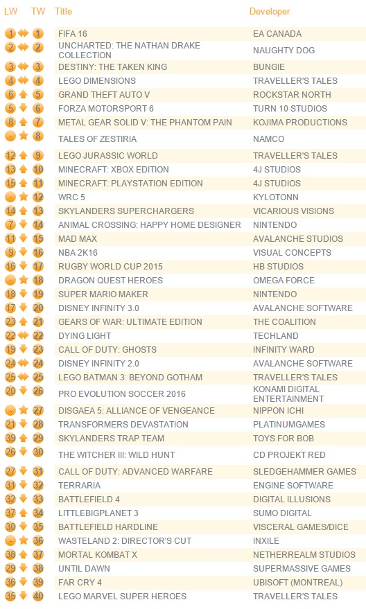 Компания Chart-Track опубликовала свежие данные о продажах видеоигр на территории Соединенного Королевства. Четверка лидеров осталась неизменной по сравнению с прошлой неделей. На первой строчке вот уже четвёртую неделю к ряду остаётся футбольный симулятор FIFA 16. Второе место сохранил за собой сборник Uncharted: The Nathan Drake Collection, продажи которого упали на 50%. «Бронза» опять досталась дополнению The Taken King для шутера Destiny (-22%).
