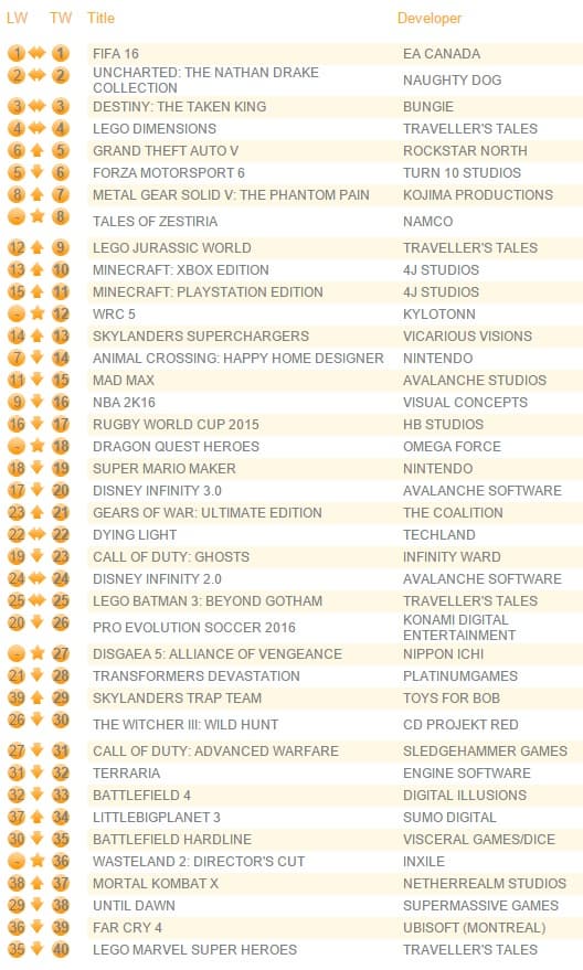 На четвёртой позиции остался проект Lego Dimensions (-17%). На пятую строчку поднялся Grand Theft Auto V, продемонстрировав рост продаж на 4%. Симулятор Forza Motorsport 6 финишировал шестым (-16%). Metal Gear Solid V: The Phantom Pain поднялся с восьмой на седьмую строчку, а его продажи выросли на 15%.