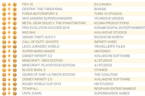 Лидером стал футбольный симулятор FIFA 16, который продался на 7% (по количеству копий) и на 4% (по доходу) хуже, чем FIFA 15 на своей первой неделе. В прошлом году пользователи Xbox 360 и PS3 купили 45% стартового тиража, в этом - всего 19%.