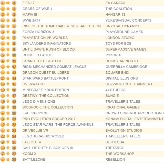 Боевик в открытом мире Mafia 3 (-54%) переместился со второй на третью позицию. На четвёртой строчке стартовал ещё один проект от 2K – симулятор реслинга WWE 2K17. Rise of the Tomb Raider: 20 Year Edition для PS4 дебютировала на пятом месте чарта продаж. Проект с концепцией «оживших игрушек» Skylanders Imaginators добрался до восьмой строчки. Dragon Quest Builders (Minecraft в мире Dragon Quest) для PS4 стартовал на 13-м месте.