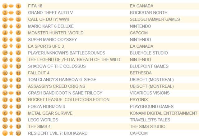 В сети появились данные о продажах физических версий игр в Британии за прошлую неделю. В условиях отсутствия новых заметных релизов тройка лидеров осталась неизменной: FIFA 18, GTA V и Call of Duty: WWII.