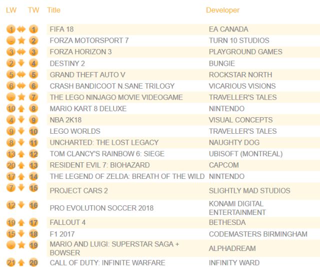 Компания Chart-track опубликовала свежие данные о продажах игр на территории Соединённого королевства. На первом месте остался футбольный симулятор Fifa 18. До второго места доехал автомобильный симулятор Forza Motorsport 7. На третьем месте осталась гоночная игра в открытом мире Forza Horizon 3, которая продаётся в составе комплекта Xbox One S FH3 Hotwheels, пользующегося спросом.