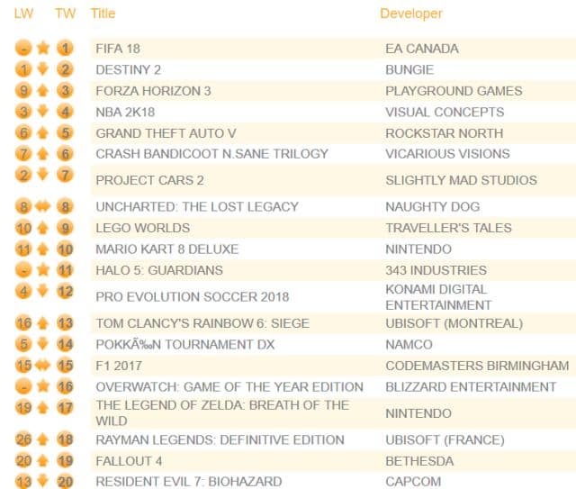 Стоит отметить, что в продаже появилось немало комплектов, включающих в себя консоль, FIFA 18 и ещё какую-нибудь игру. В частности, в состав таких комплектов входят Halo 5: Guardians и Forza Horizon 3, которые поднялись на 11-ю и 3-ю строчку чарта соответственно.