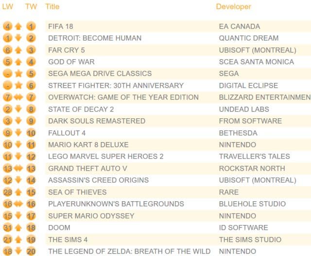 На третье место поднялся проект Far Cry 5 (продажи выросли на 36%). Падение продаж на 19% не помешало God of War подняться с пятой на четвёртую строчку чарта. Продажи Dark Souls Remastered снизились на 65%, а игра опустилась с третьей на девятую строчку чарта.