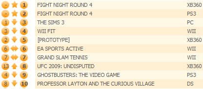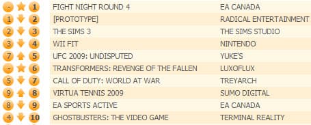 Prototype, The Sims 3 и Wii Fit плавно переместились на второе, третье и четвертое места, соответственно. UFC 2009: Undisputed, несмотря на выход конкурента, смог укрепить свои позиции, поднявшись с седьмого на пятое место.
