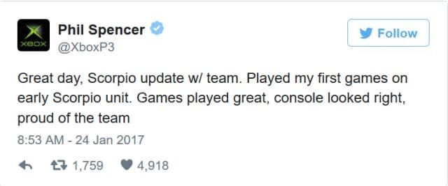 «Впервые поиграл на ранней версии Scorpio. Игры идут замечательно, консоль выглядит хорошо, горд за команду», - написал Фил Спенсер в своём твиттере.