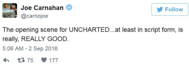 Карнахан написал в твиттере, что вступительная сцена из фильма по мотивам Uncharted «ОЧЕНЬ ХОРОША», по крайней мере, в сценарии.