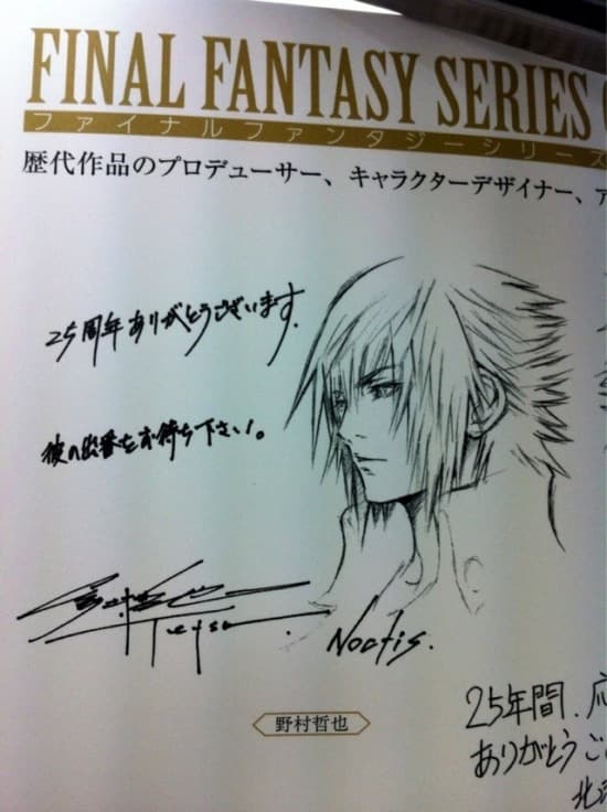 Затем в Сети появилось изображение рекламной брошюры Final Fantasy 25th Anniversary Ultimate Box, на котором виден главный герой Versus по имени Ноктис (Noctis), а надпись на японском гласит: «Пожалуйста, дождитесь его возвращения!».