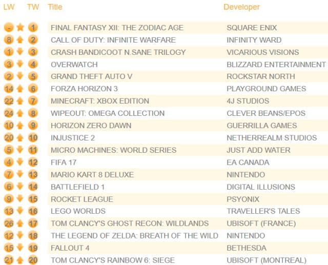 Лидер двух прошлых недель, сборник Crash Bandicoot N.Sane Trilogy опустился на третье место. Благодаря скидкам и выгодным предложениям от торговых сетей выросли продажи Call of Duty: Infinite Warfare, Overwatch, Forza Horizon 3 (продавалась в комплекте с Xbox One S), Wipeout: Omega Collection и ряда других игр.