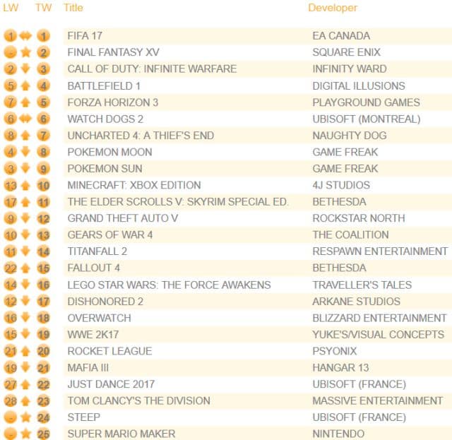 Японская ролевая игра Final Fantasy XV дебютировала на второй строчке. Final Fantasy XV стартовала хуже Final Fantasy XIII, продемонстрировавшей в 2010 году лучший старт продаж за всю историю франшизы. Тем не менее, Final Fantasy XV на старте продаётся лучше, чем все остальные части серии.