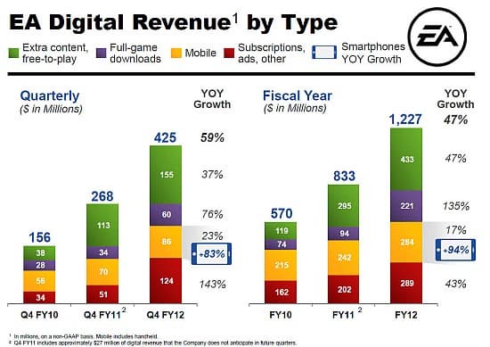 Компания EA отчиталась о своих достижениях за прошедший финансовый год. Да-да, именно о достижениях, компании удалось получить прибыль в размере $76 млн., в то время как годом ранее сообщалось об убытках в $276 млн. Доходы компании также возросли. Если в прошлом году они составляли $3,59, то в этом - $4,14 млрд. EA удалось достичь таких результатов благодаря таким проектам как Mass Effect 3, SSX и Kingdoms of Amalur. Также отмечаются успехи шутера Battlefield 3, в котором сегодня насчитывается более 6,3 млн. активных игроков. Новые порции DLC для него запланированы на май и июнь. Теперь пройдемся по интересным числам.