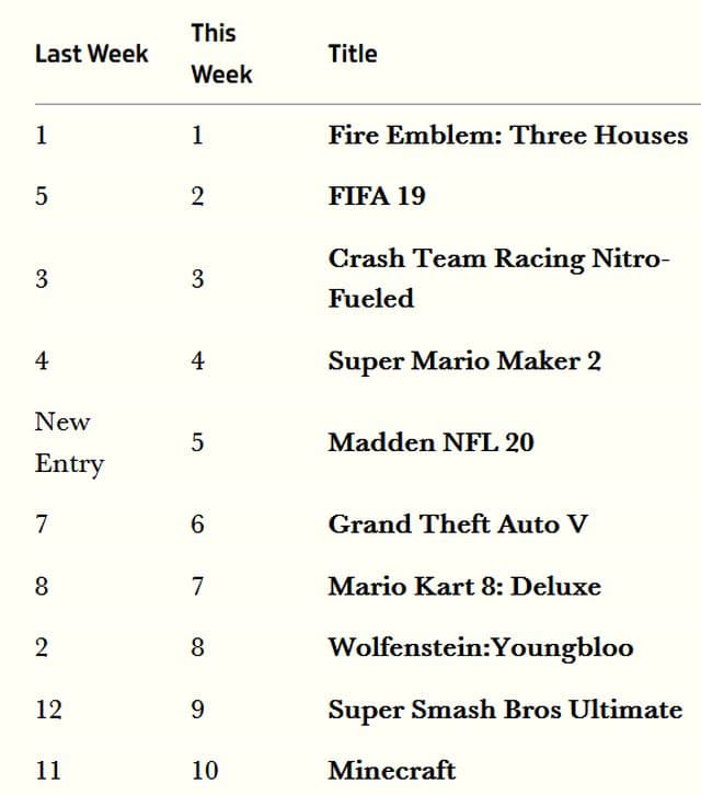 На первом месте осталась пошаговая тактика Fire Emblem: Three Houses для Switch, продажи которой снизились на 60% по сравнению с предыдущей неделей. Всего на 66 копий от лидера отстал футбольный симулятор FIFA 19. Wolfenstein: Youngblood опустился со второй на восьмую строчку, а продажи проекта снизились на 61%. Симулятор американского футбола Madden NFL 20 стартовал на пятом месте.