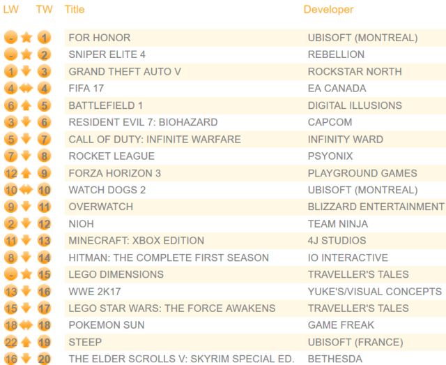 На второй строчке расположился стелс-боевик Sniper Elite 4. На третьем месте оказался боевик в открытом мире Grand Theft Auto V. Благодаря скидкам и выгодным предложениям от торговых сетей выросли продажи FIFA 17 (+45%), Battlefield 1 (+48%), Forza Horizon 3 (+138%) и Lego Dimensions (+187%).